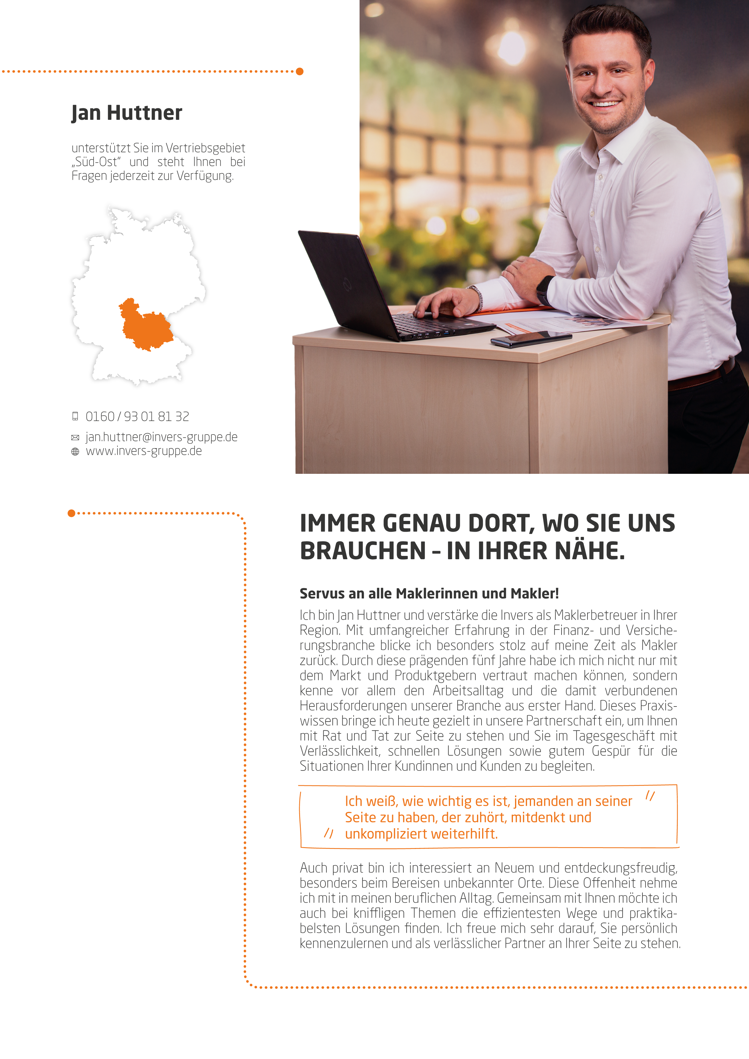 Wir setzen auf die persönliche Betreuung unserer Partner vor Ort. Deshalb unterhält die Invers ein deutschlandweites Netz aus Maklerbetreuern. So sind wir immer dort, wo Sie uns benötigen - in Ihrer Nähe.